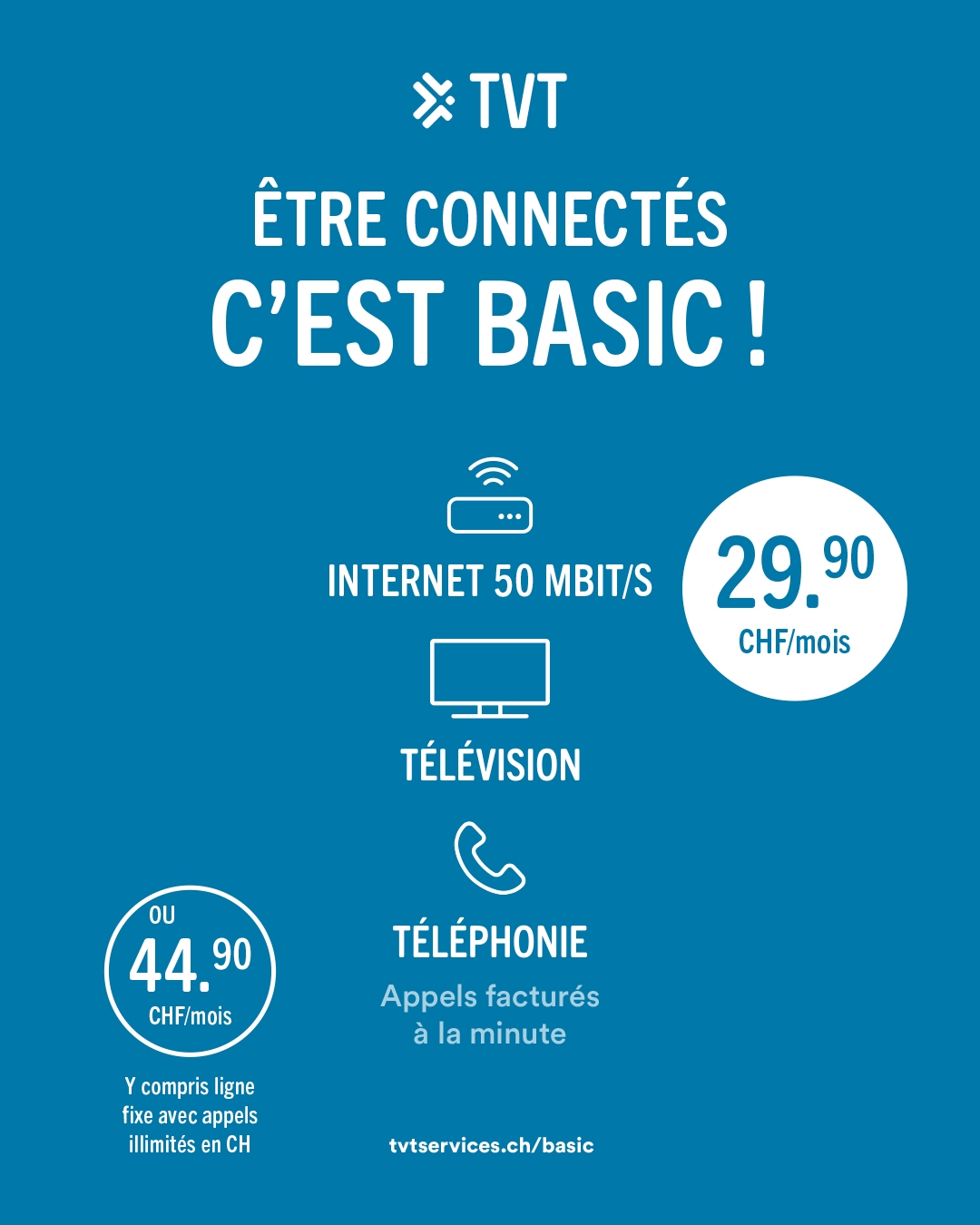 TVT Basic, c’est une offre simple et complète qui répond aux besoins du quotidien, sans superflu. Pensée pour toute la maison, elle réunit Internet, télévision et téléphonie fixe pour seulement CHF 29.90/ mois.